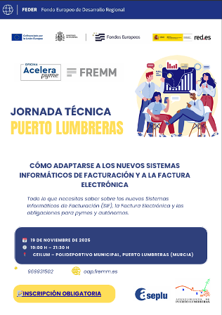 La Oficina Acelera Pyme (OAP), adscrita a la Federación Regional de Empresarios del Metal de Murcia (FREMM) y abierta a todas las empresas y autónomos de la Región de Murcia, explicará la nueva facturación electrónica y el sistema Verifactu a los empresarios de Puerto Lumbreras.